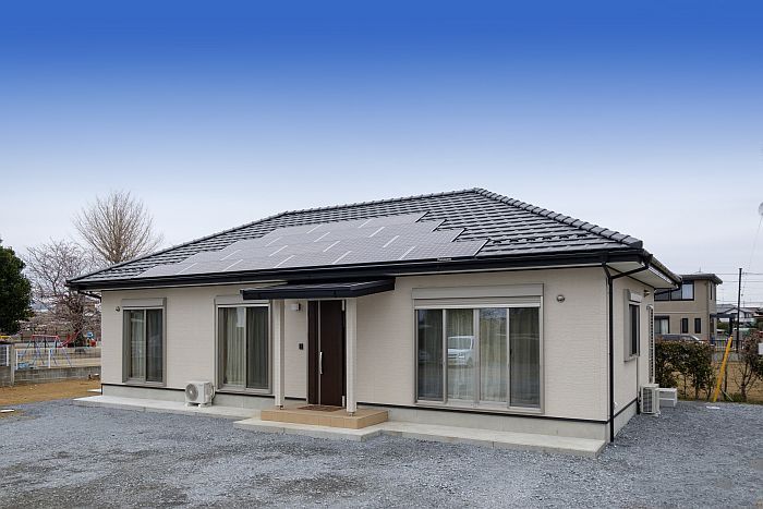 シンプルで飽きのこない佇まいに、ソーラーパネルを搭載した省エネ住宅。