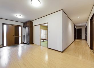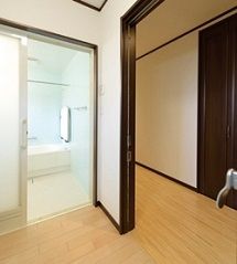 車椅子利用に対応した建具で開口を大きく取った洗面脱衣。