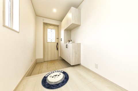 白を基調にした明るい玄関玄関ドアの採光部分が大きいのも明るさのポイント