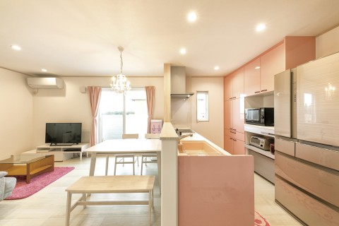 白とピンクでまとめた可愛くておしゃれなLDKにシャンデリアが良く合いますキッチン:Panasonicラクシーナ