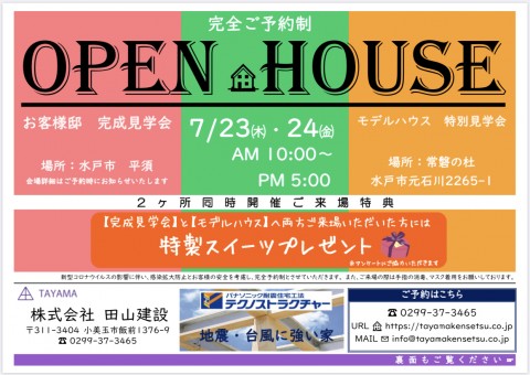7/23(木)・24(金)のお客様邸とモデルハウスの2か所同時見学会で実物をご覧いただけます。
