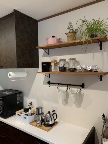 家族の形に合わせて棚や有孔ボードを上手に取り付けているからお子様にも使いやすいですね。