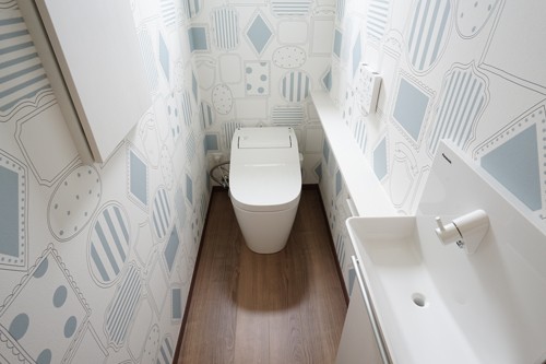 居室は落ち着いたトーンでまとめましたがトイレだけは思い切って可愛い柄のクロスを選びました。