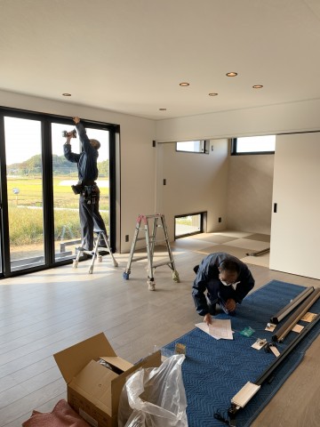今日はウッドデッキ工事と網戸工事とカーテン工事が入っていました。