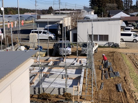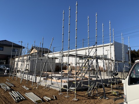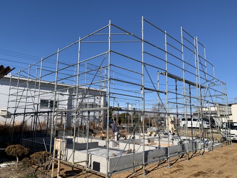 田山建設事務所新築工事は足場が設置され土台敷きが始まりました。