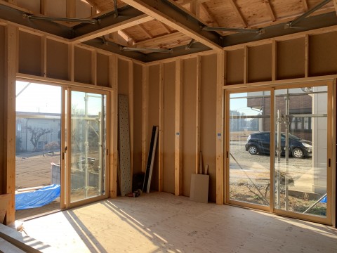 1月21日の田山建設事務所新築工事はサッシ取付工事と透湿防水遮熱シートの施行をしていました。