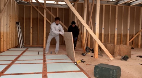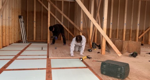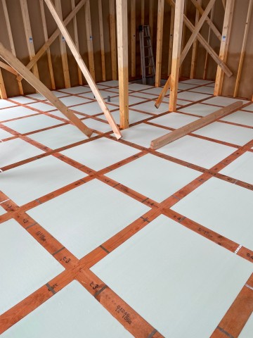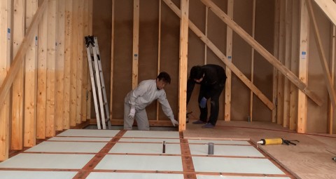 断熱材が入ったら今度は28mm厚さの合板を貼っていきます。