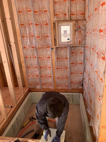 拓実氏はユニットバスを施工する前に壁と基礎に断熱材を入れています。