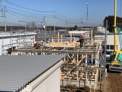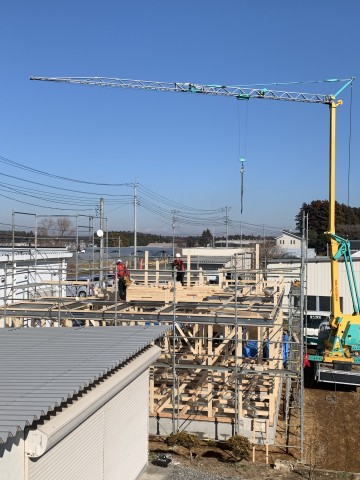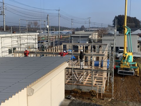 太陽の陽ざしと青空がとても気持ちのいい日に上棟できてとっても良い気分です!