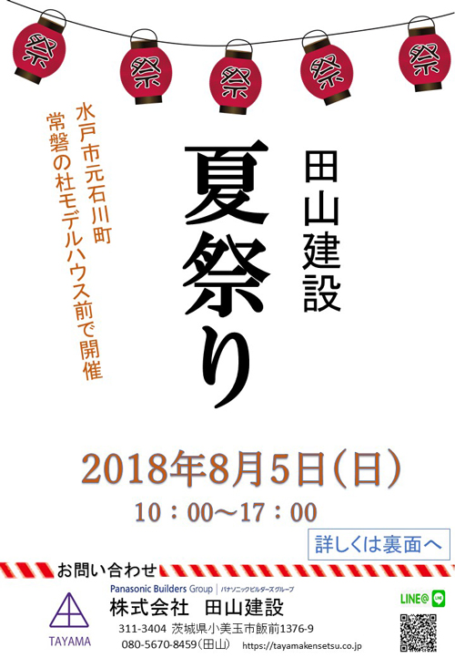 8月5日(日)10:00~17:00 田山建設の夏まつりが開催されます。