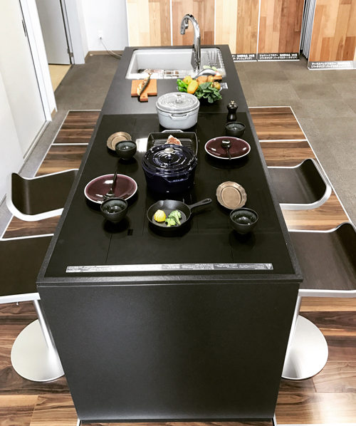 このキッチン、真ん中がIHになっていて両方向で操作ができます。綾瀬はるかさん主演の「奥様は取り扱い注意」で使われていたんですよ!