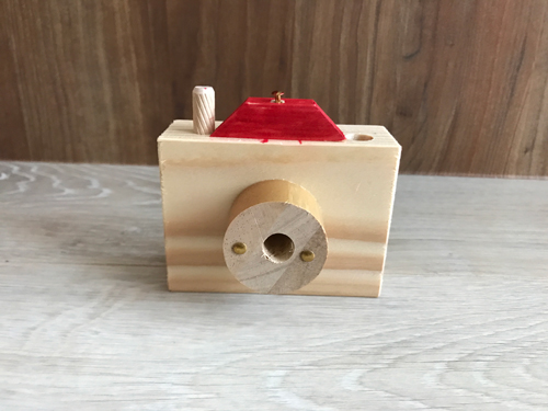 釘を使って組み立てるとカメラの形のペン立てになるのです!