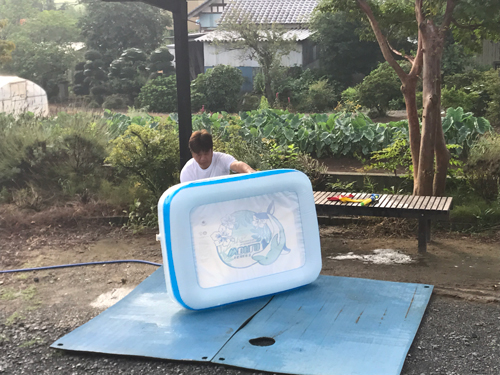 まだみんなが起きてこないうちからプールの準備をしているじいじ