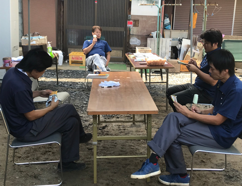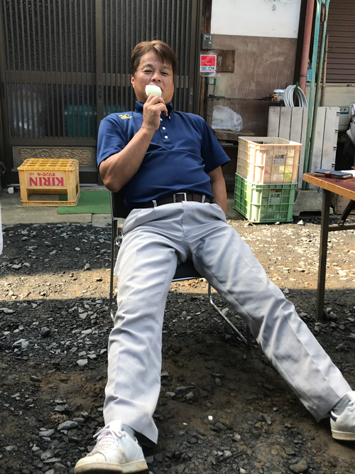 O様からアイスの差し入れをいただき休憩中!久しぶりのアイスを食べる社長の写真です。