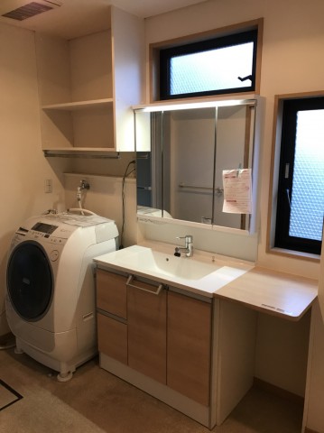 洗面化粧台を交換(パナソニックCライン)・洗濯機上部と壁に棚・洗面台わきにはカウンターとを設置しました。