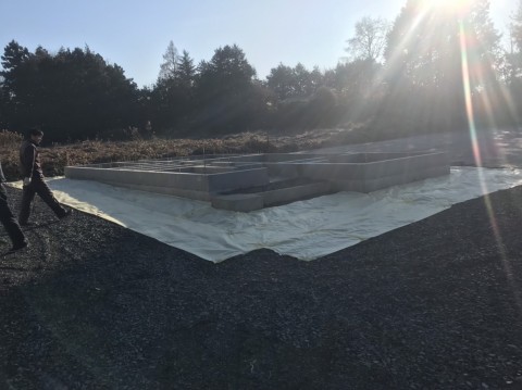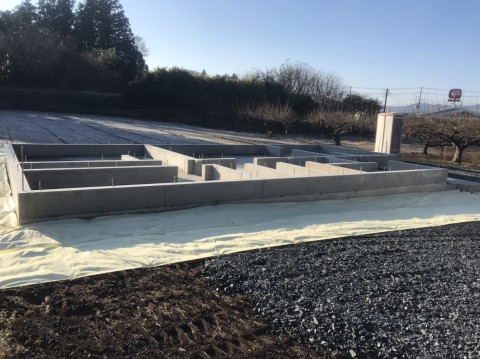 基礎の周りに養生シートを張りました。施主様にお引渡しをするまで建物が汚れないようにしています。(石岡市M様邸)
