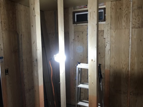 壁に棚をつけるために下地処理をしています。 石岡市M様邸