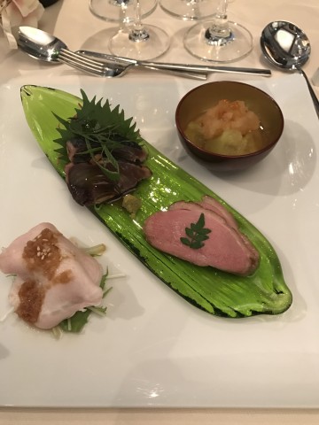 なんざんはうす 前菜(戻り鰹のお造り・焼き茄子・飛騨けんとん豚のしゃぶしゃぶ・合鴨ロースの醤油煮仕立て) (名古屋市)
