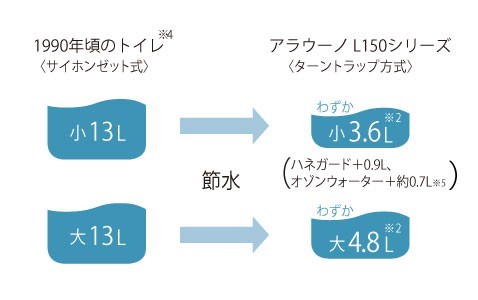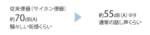 少ない水量で効率よく流すので洗浄音は従来に比べ話し声レベルの気になりにくい音量に。