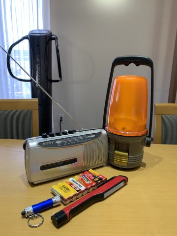 停電に備えてランタン・懐中電灯・ラジオ・カセットコンロとカセット用ガスボンベ、乾電池も用意。
