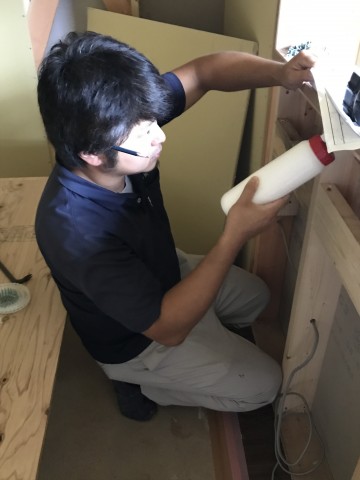 1階キッチンのボードはりをしている拓実君