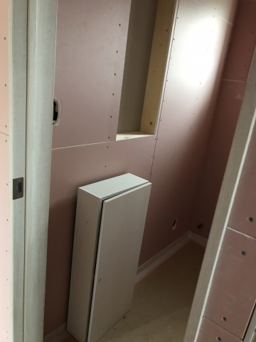 まだクロス工事が終わっていないし床の養生も取れていないのでわかりづらいですね。