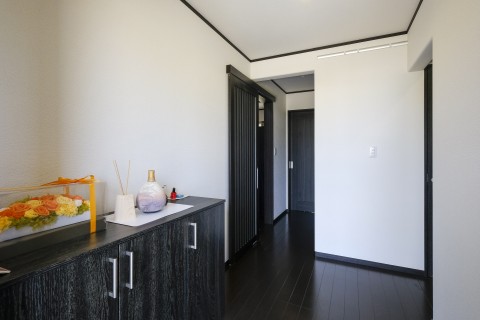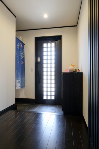 ホールから玄関を見る。ガラスの格子がステキで明るい玄関