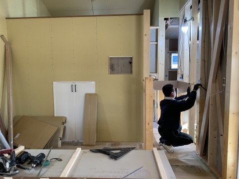 田山建設事務所新築工事・今日もボード貼ってます