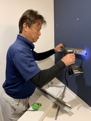 文男氏はゆっくりするんだろうなと思っていたら事務所洗面所の棚をつけてくれました。