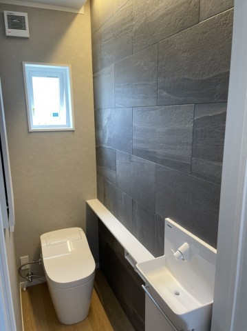 お施主様ご家族で施工したエコカラットの壁がカッコいいトイレ