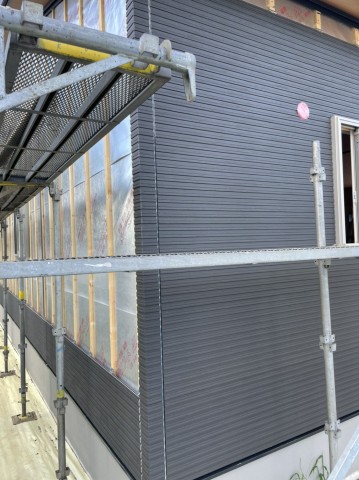 外壁はケイミュー・ネオロック光セラ16 キャストストライプ チャコールチタンブラック