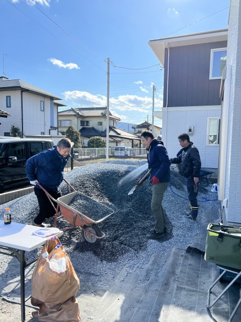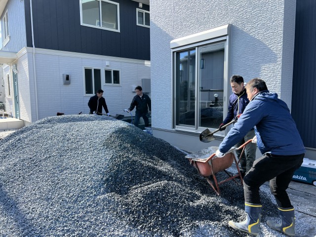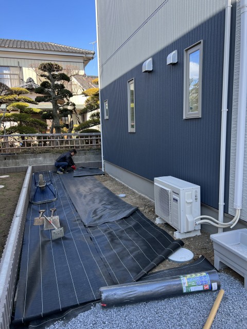すべてのご案内が終わった後、お家のまわりに防草シートをはり砕石敷きをしました。