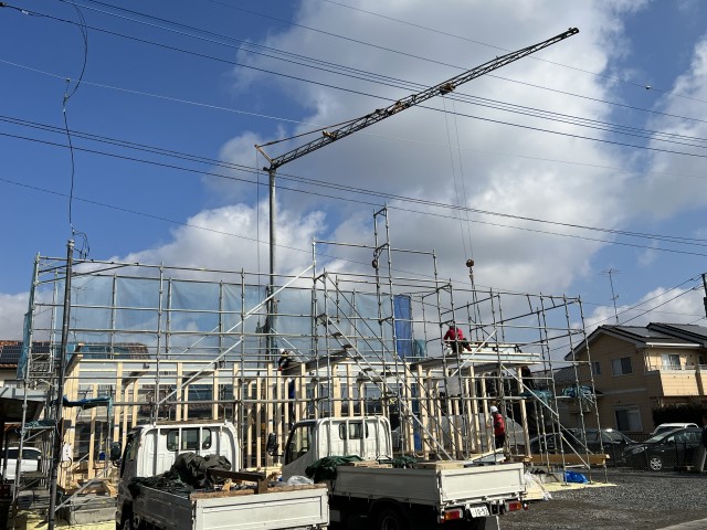 材料の納期の関係で予定よりも遅くなってしまいましたが快晴のもと無事に上棟することができました。