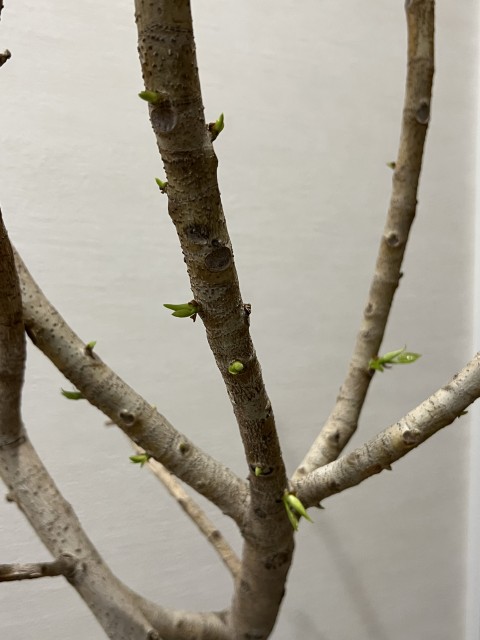 事務所にあるゴムの木ですが、虫がついて葉を全部落としてしまい枯れちゃったかなと思っていたらたくさんの新芽を出していました。