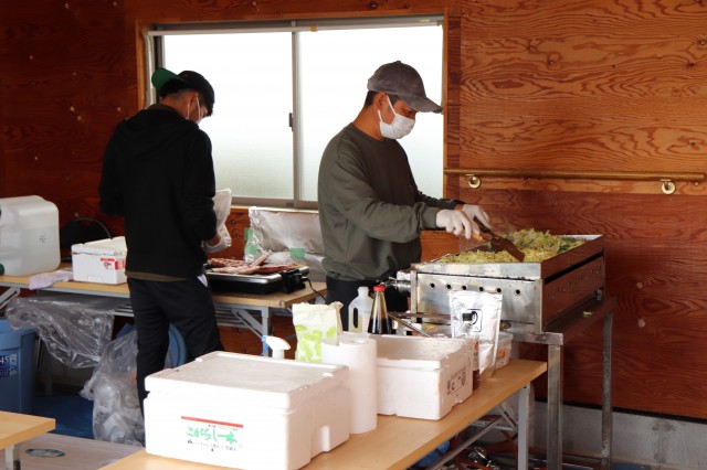 焼きそばとフランクフルトは業者会の和電気さん。社長直々に焼いてくれました。