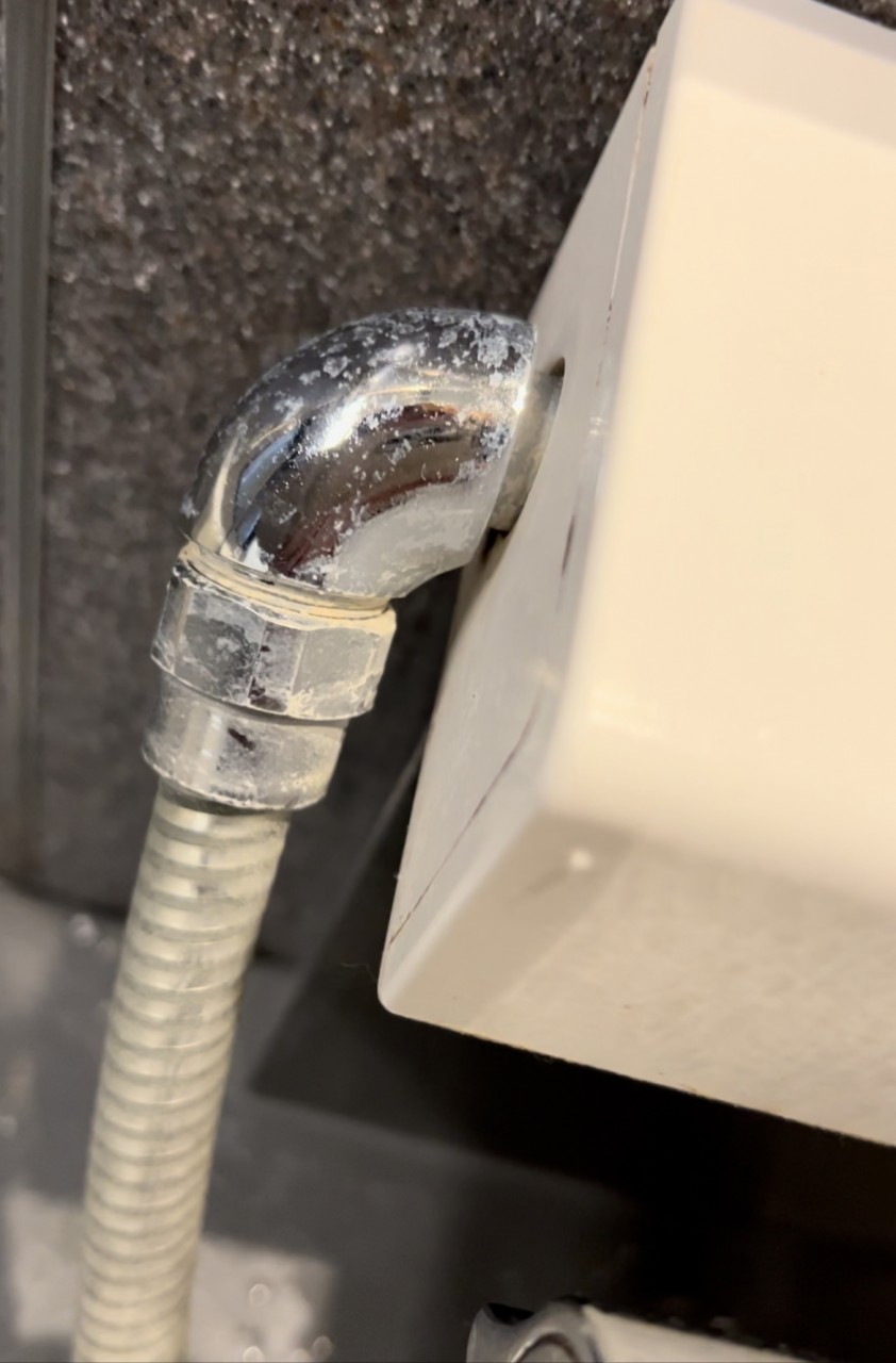 浴室シャワーの取付金具についたカリカリにこびりついた汚れ。