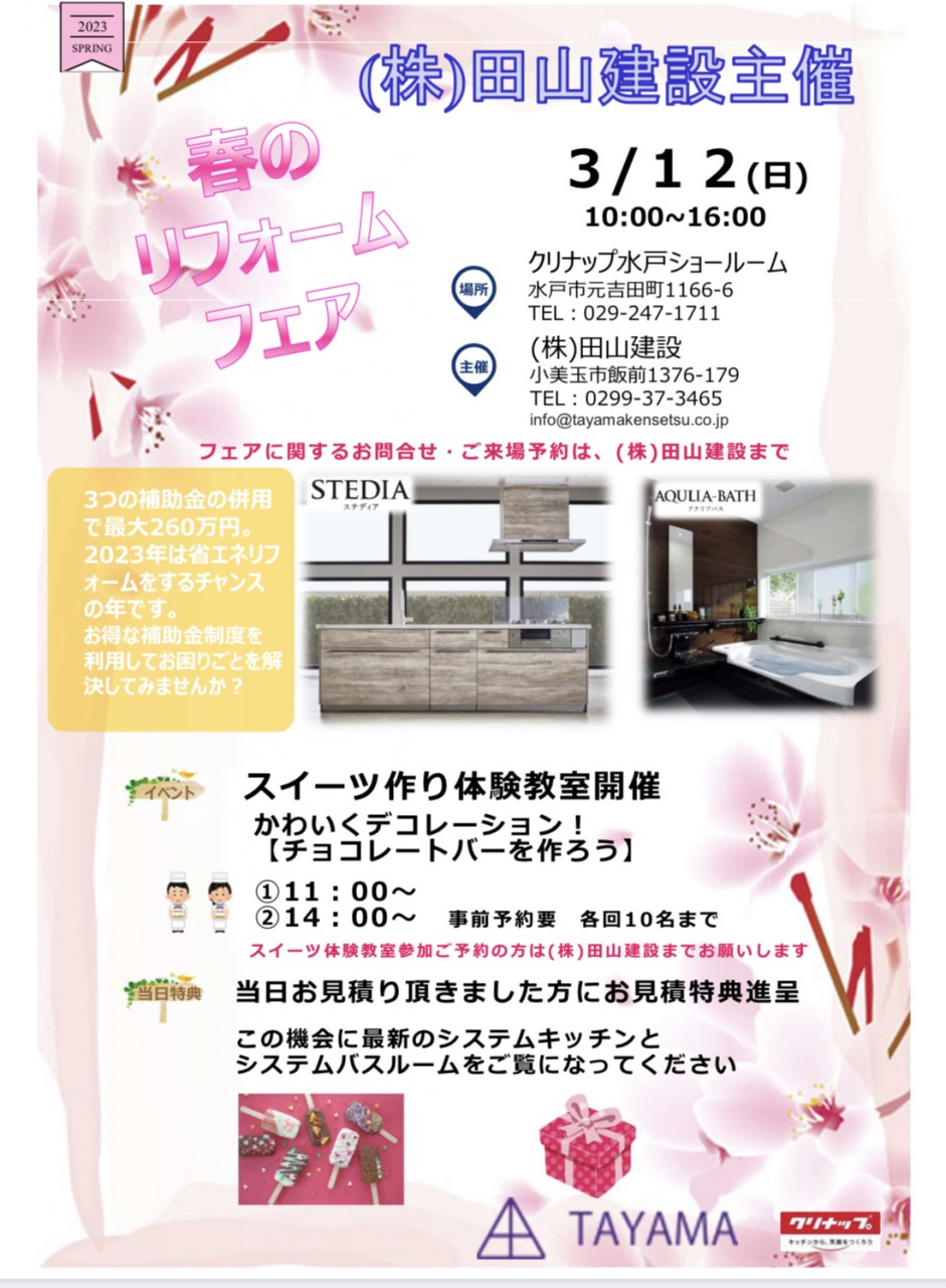 3月12日(日)クリナップ水戸ショールームで春のリフォームフェアを開催いたします。