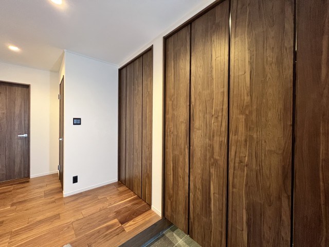 玄関収納の扉はパナソニックベリティスのウォールナット柄