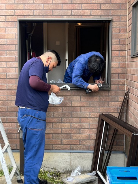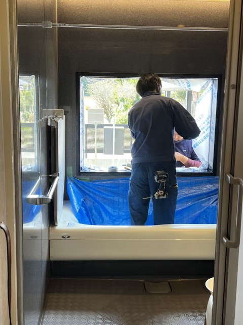 今日は浴室の窓、明日は玄関ドア、明後日はトイレと脱衣室の工事となります。