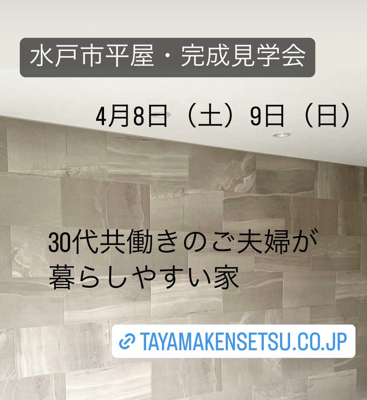 明日、4月8日から水戸市大塚町で30代ご夫婦が暮らしやすい平屋のお家の完成見学会です。