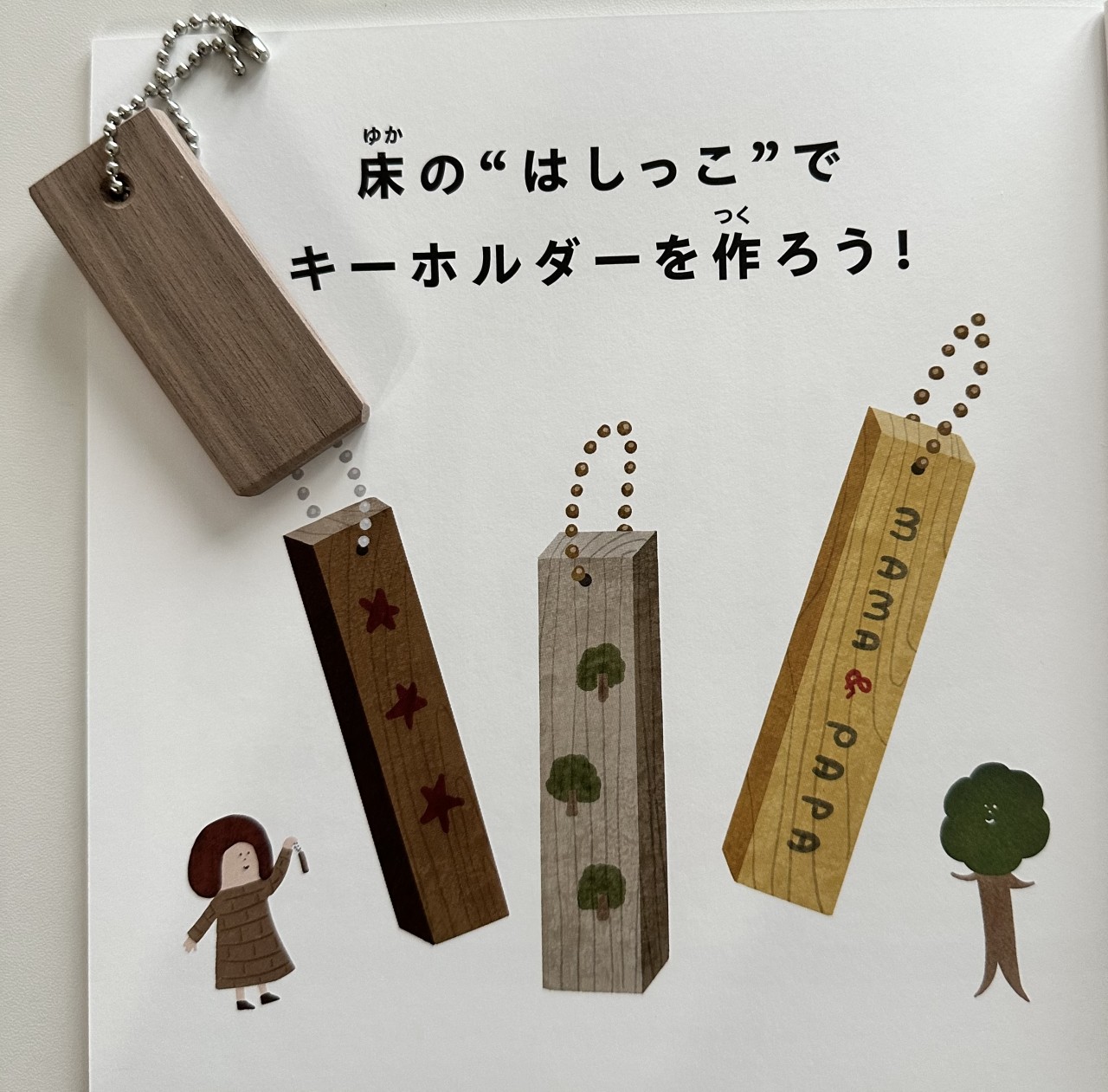 という木や床のことが分かりやすく描かれた絵本と床のはしっこを使って自分で作るキーホルダー