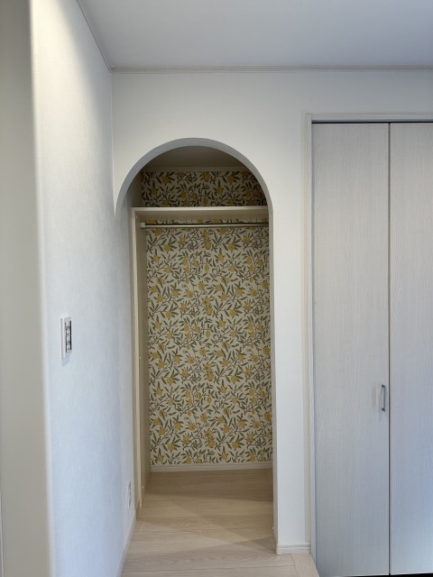玄関を入るとウィリアムモリスの壁紙が可愛いクロークがあります。