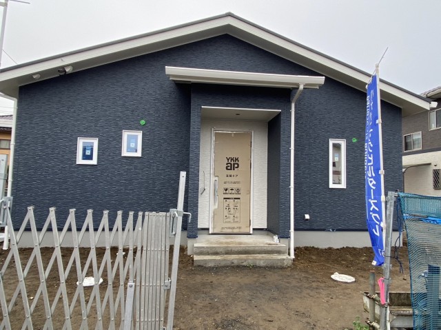ネイビーとホワイトの可愛い平屋のお家に温かみのあるオレンジ系のタイルを選ばれました。