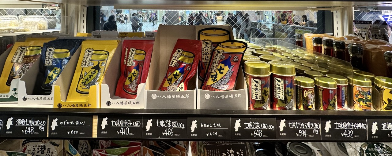 棚にこんなにたくさんの種類の八幡屋礒五郎の唐辛子が並んでた。