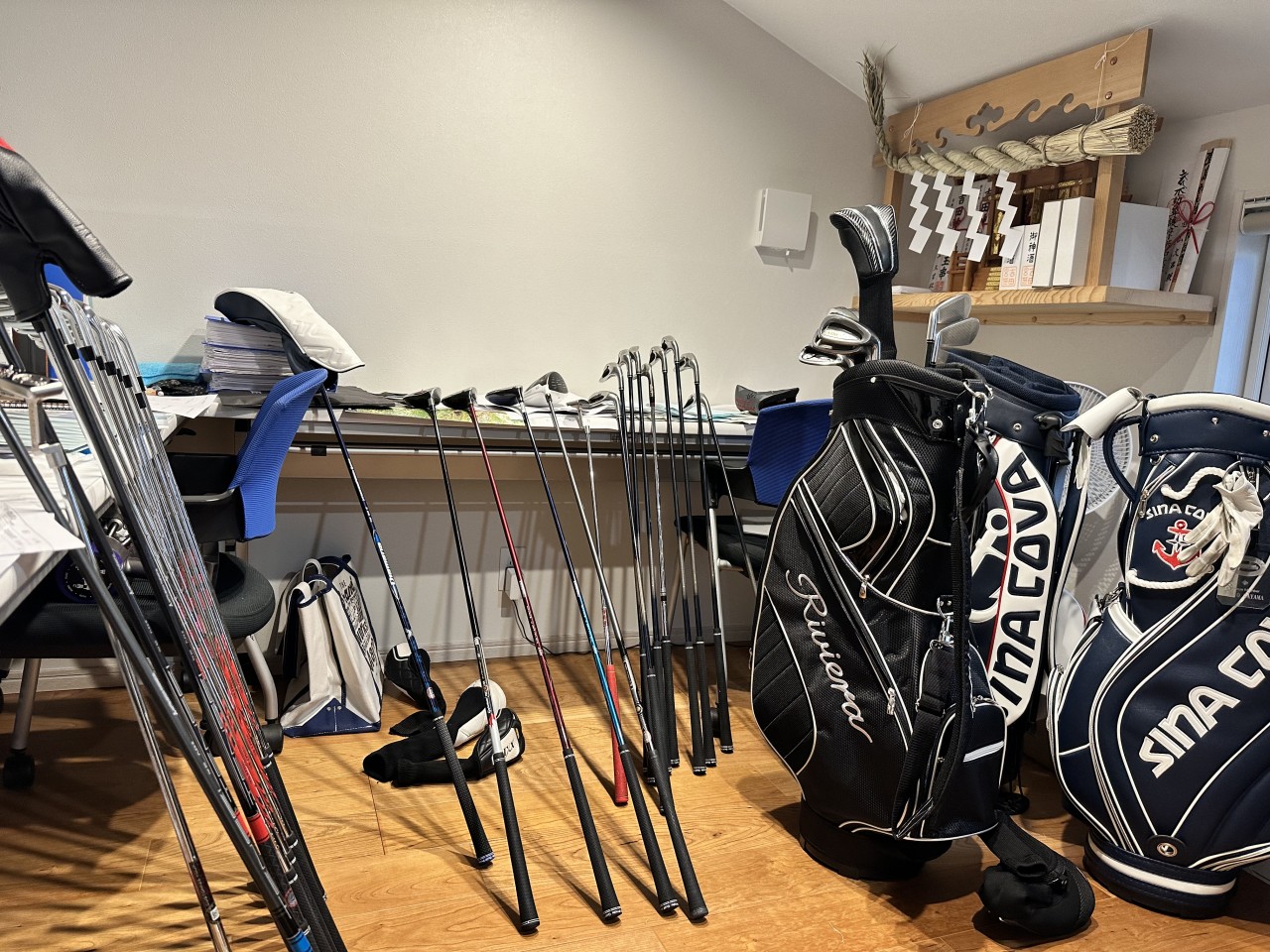 ゴルフの後はクラブを乾かすために社長の部屋に並べたらゴルフショップみたいになってました。