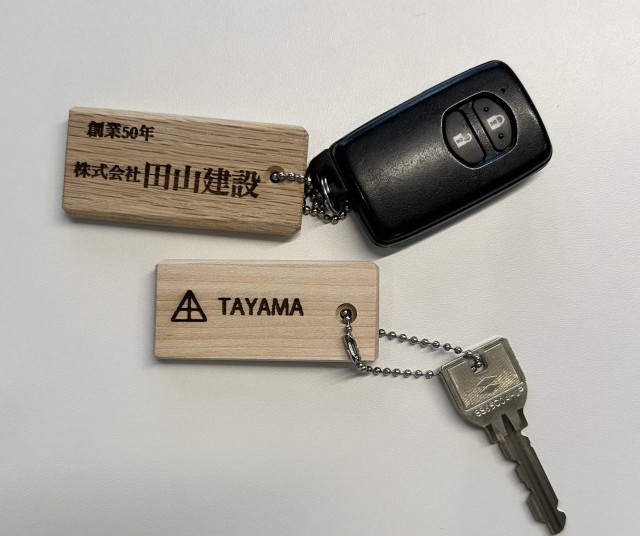 フローリングに使われている銘木でつくったキーホルダーにイラストやネームなどを焼き付けてオリジナルキーホルダーとしてプレゼントしちゃうよ!