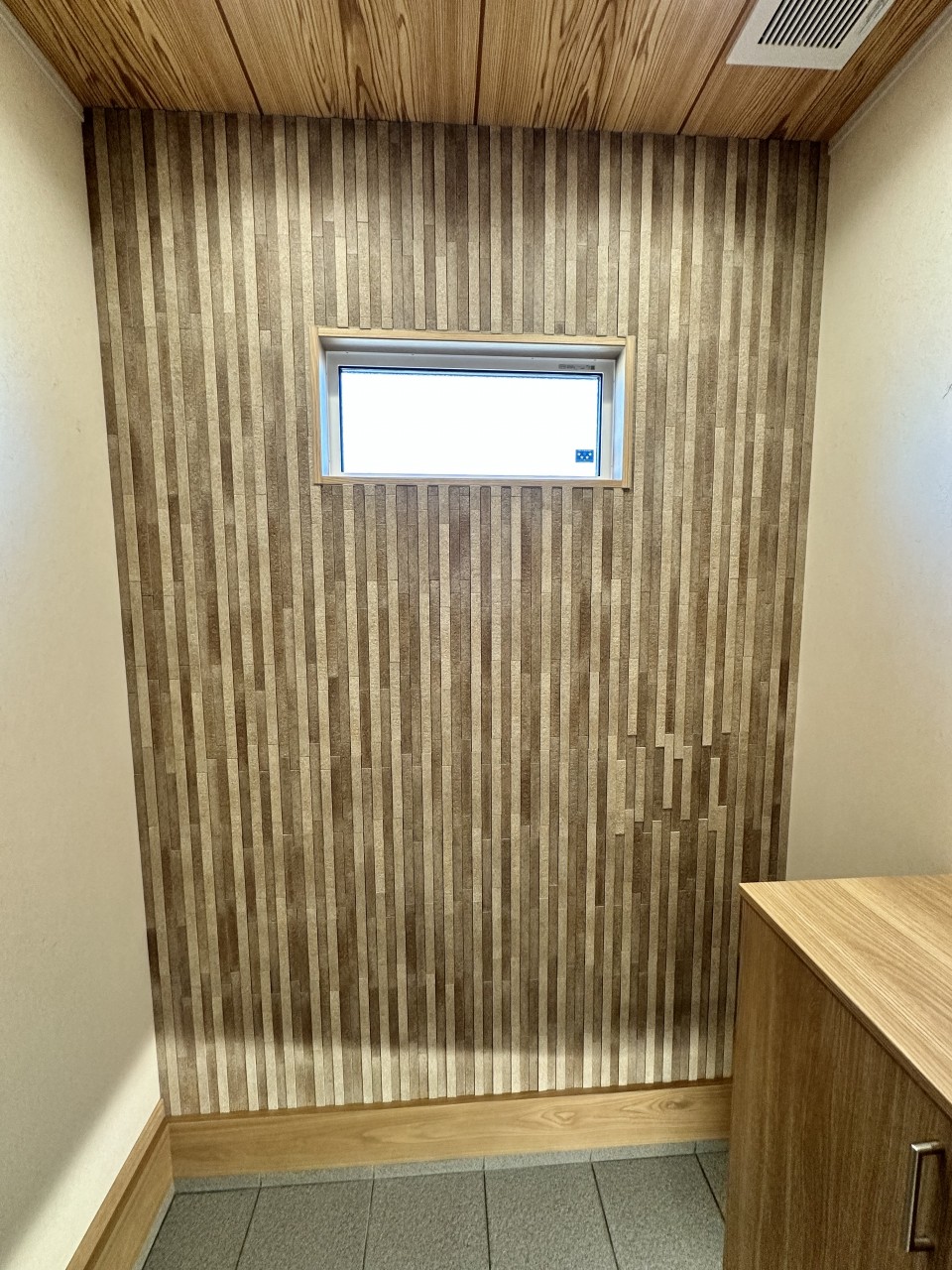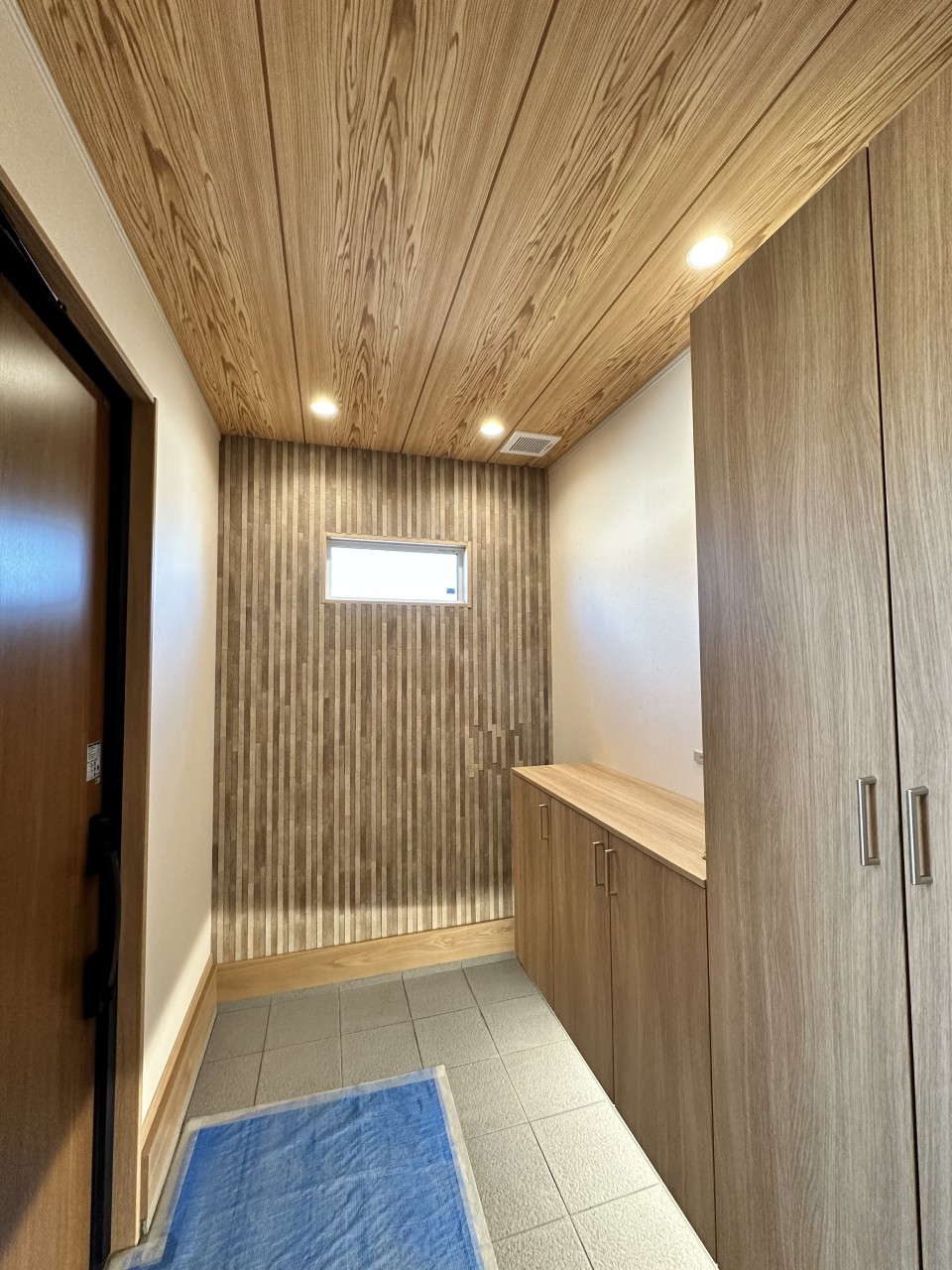 玄関に入るとご家族で貼ったエコカラットの壁。