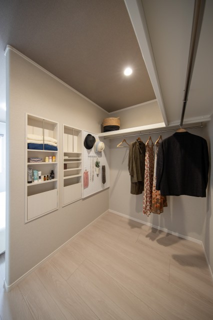 洋服を収納するだけじゃなく、有孔ボードで帽子やネクタイなどをかけて収納したり壁厚収納を利用して細かなものもわかりやすく収納できるようになっています。