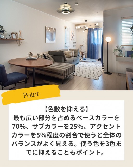 最も広い部分を占めるベースカラーを70%、サブカラーを25%、アクセントカラーを5%程度の割合で使うと、全体のバランスがよく見えます。
