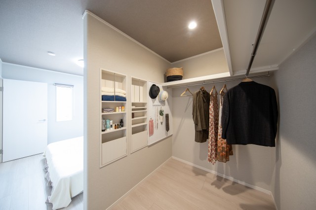 寝室奥のウォークインクローゼットは壁厚収納と有孔ボードで小物もすっきりと片付きます
